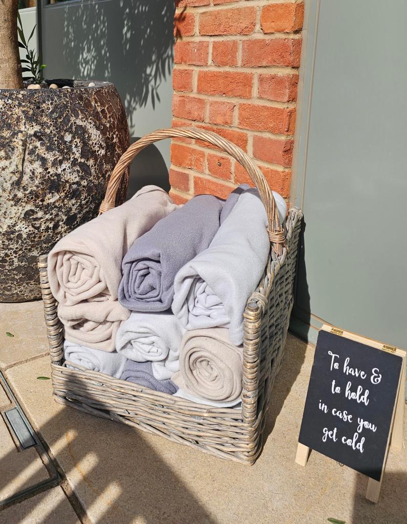 Blanket basket with 9 fleece blankets and sign – £20 to hire
