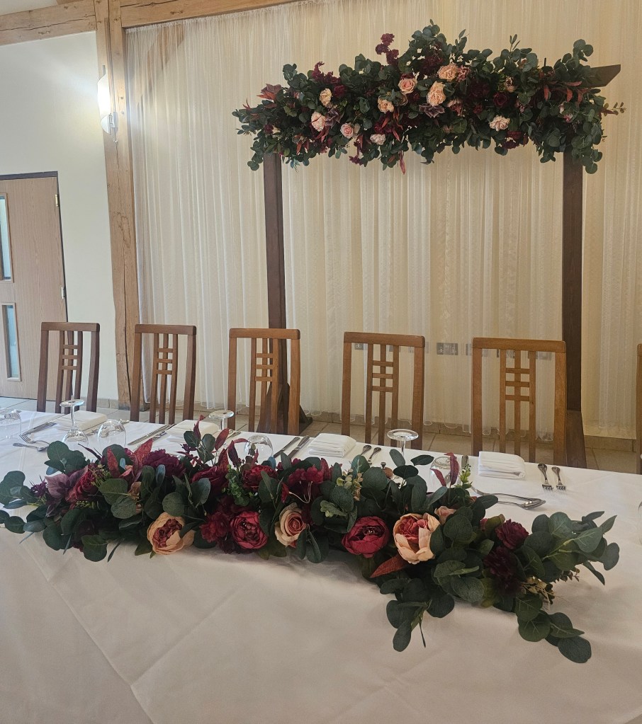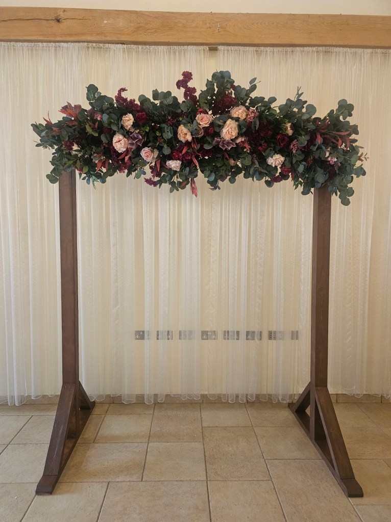 This beautiful floral arrangement showcases a blend of burgundy and nude tones, elegantly framed by lush eucalyptus on our wooden arch.