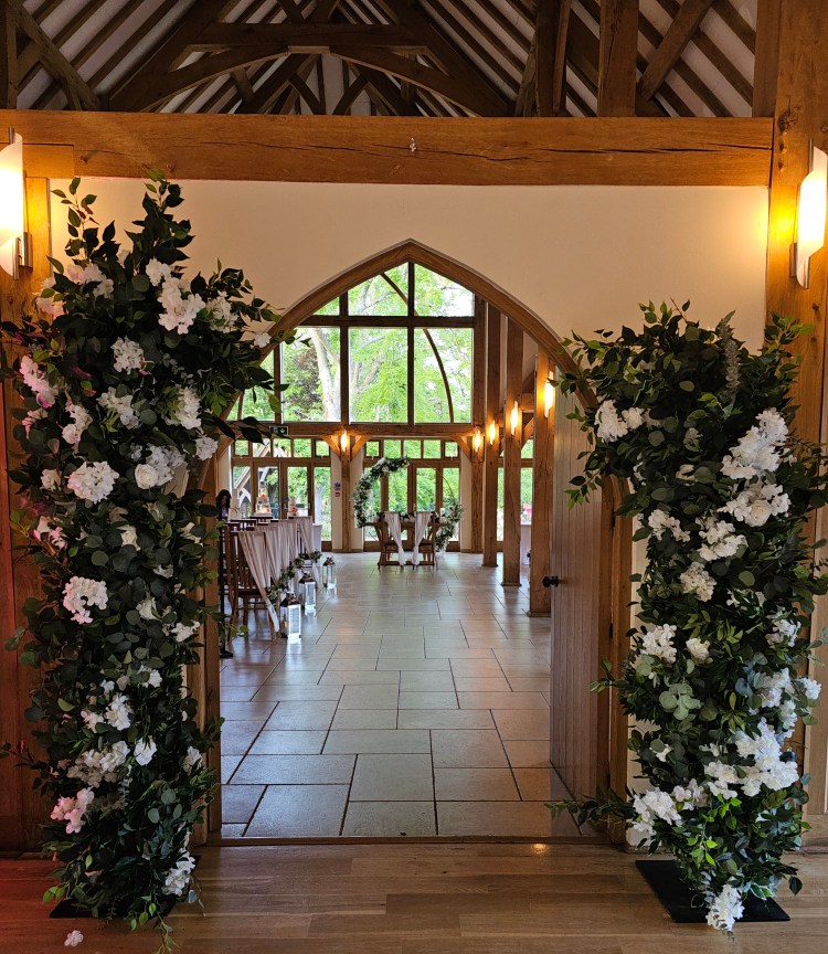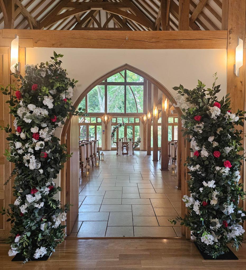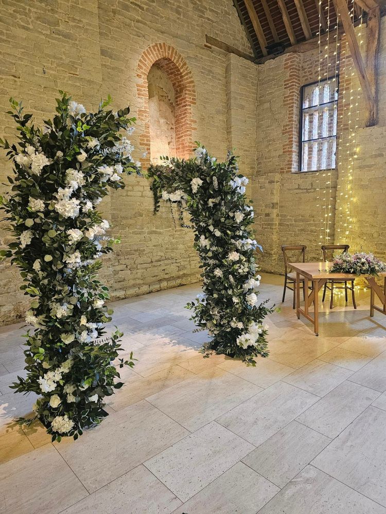 The columns measure 2.4m and 1.6m tall. They feature a mix of high quality silk foliage, roses, hydrangeas and delphiniums.