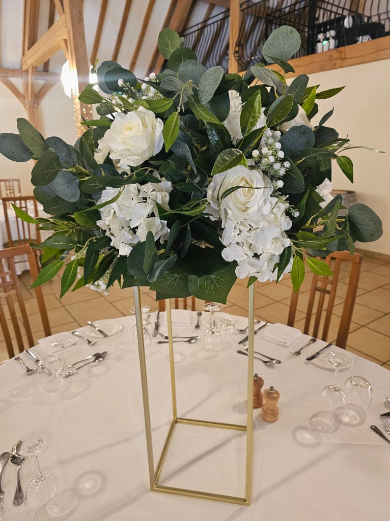 White roses, hydrangeas, delphiniums and eucalyptus – can be displayed flat on a table or on our tall gold stands.