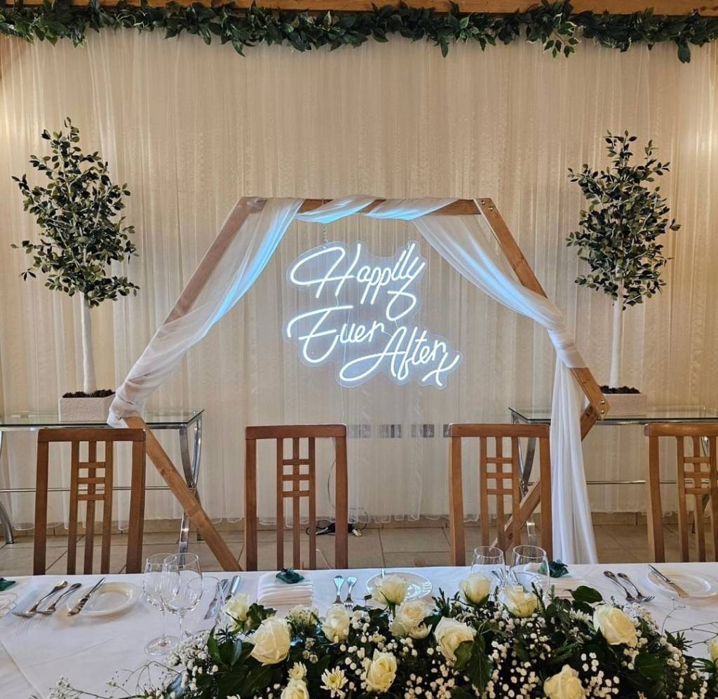 Our ‘Happily ever after’ neon light can also be hung from the arch