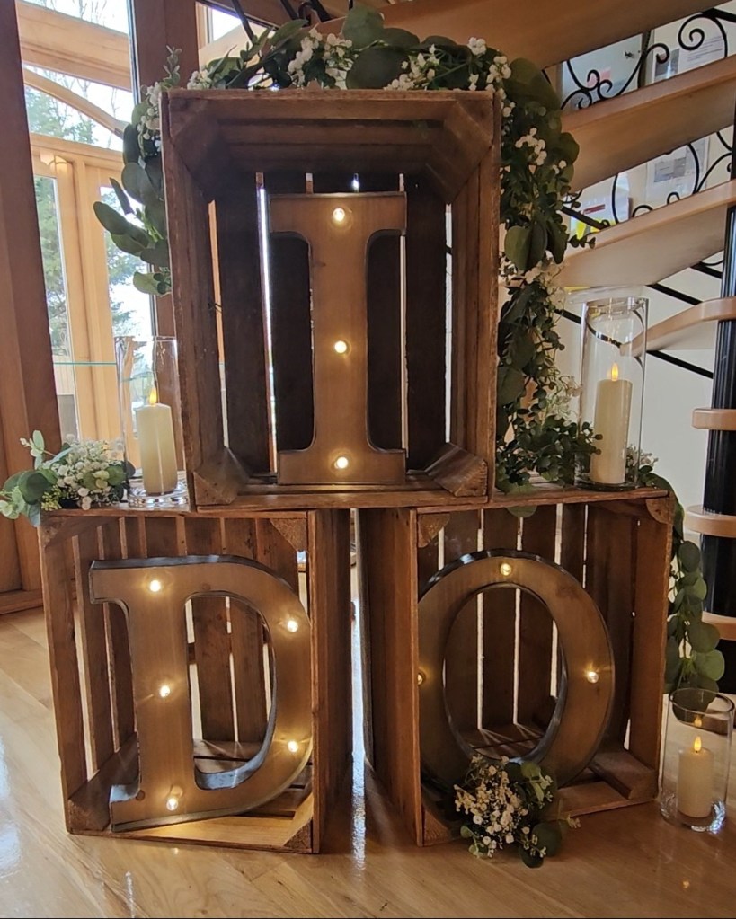 **Lights , crates, eucalyptus + gypsophila garland, eucalyptus + gypsophila bunches, trio of tall vases with LED candles £65