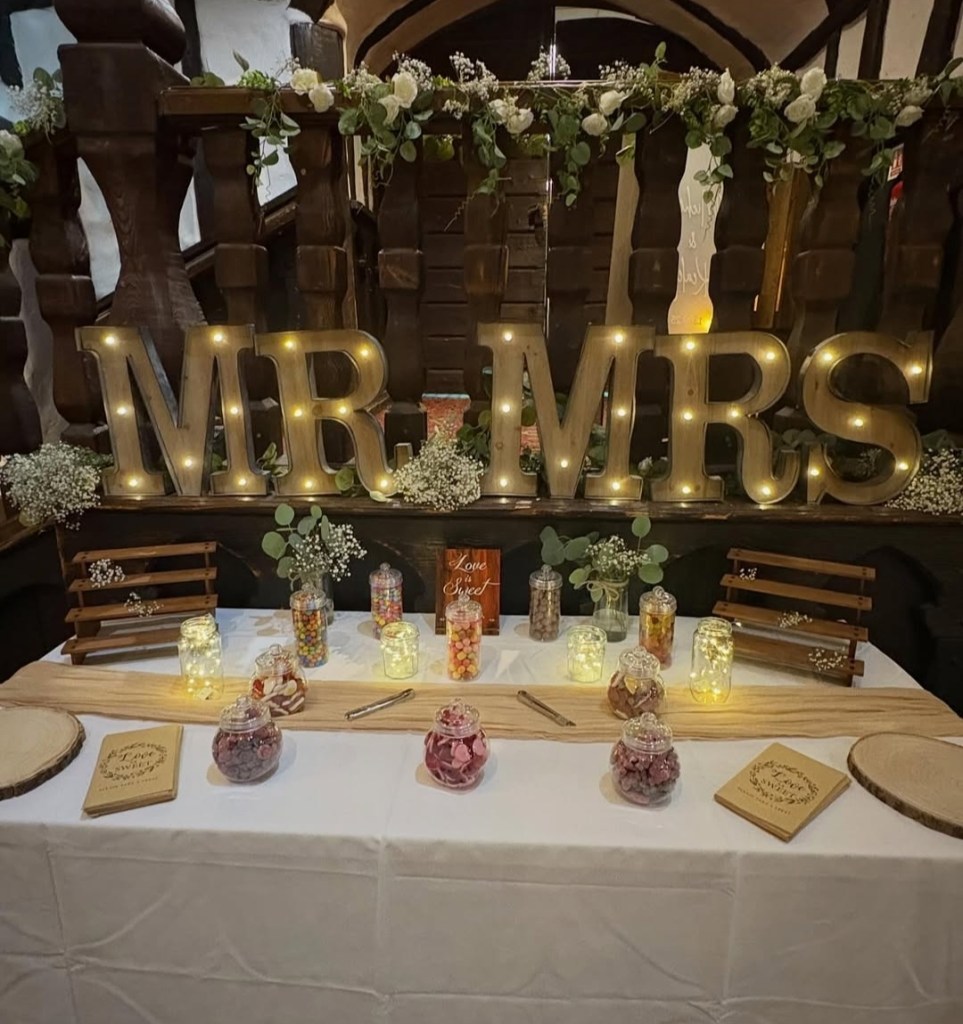 **Lights , crates, eucalyptus + gypsophila garland, eucalyptus + gypsophila bunches, trio of tall vases with LED candles £45