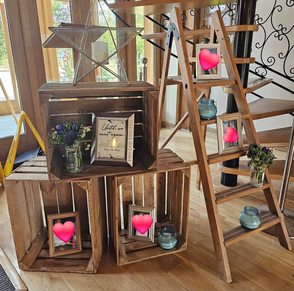 5 crates, rustic ladder, LOVE letters, trio of copper lanterns (with LED candles) + large wicker heart