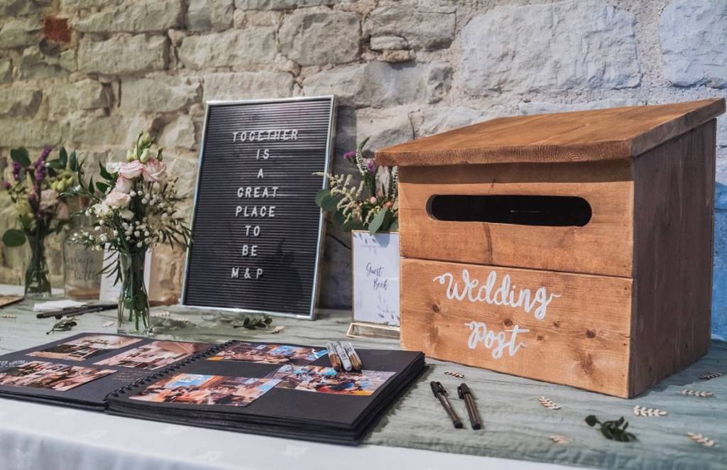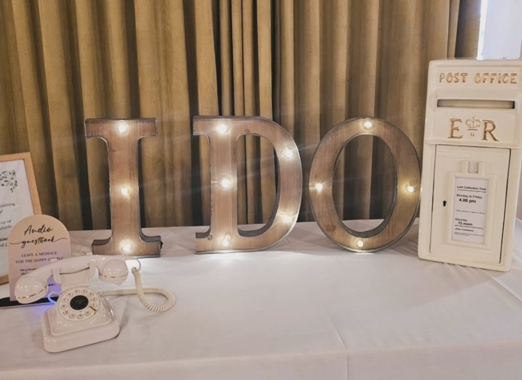 Including our Audio Guestbook + sign, I DO lights, Ivory Post Box