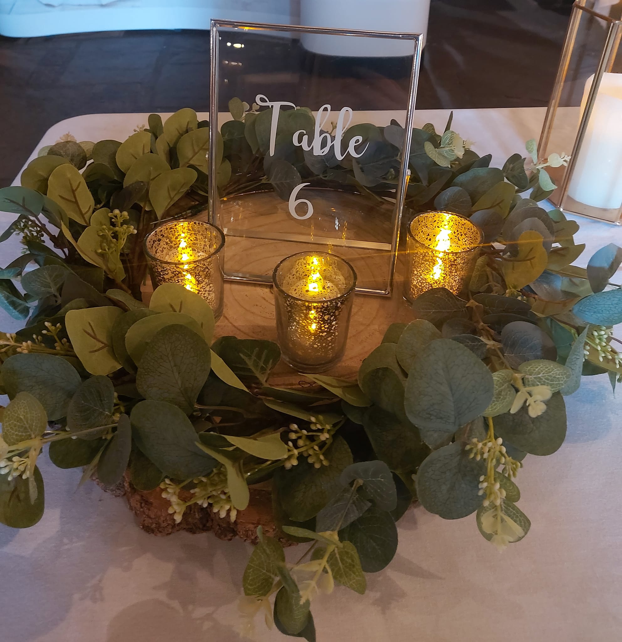 I.e wooden log slices + eucalytpus wreaths + cylinder vases = a bundle price.