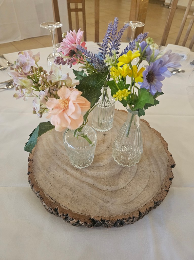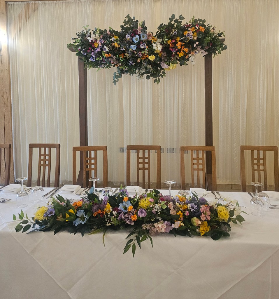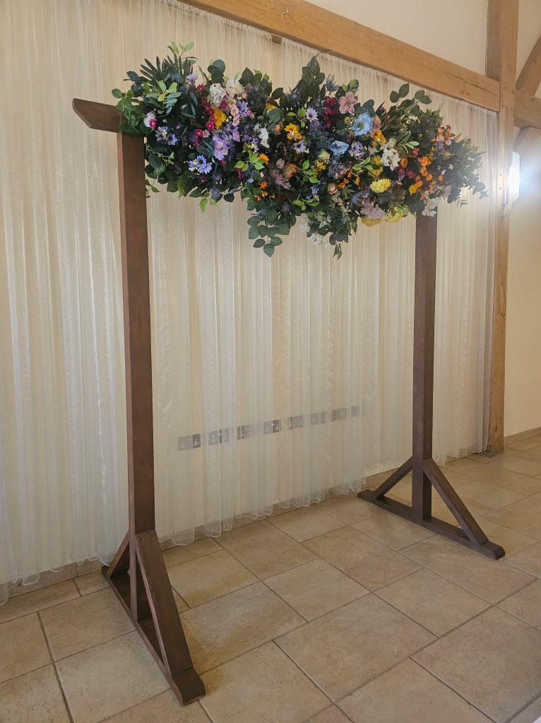 Our beautiful floral arrangement Bursting with high-quality faux wildflowers, including daisies, roses, lavender, and spring foliage son our wooden arch.